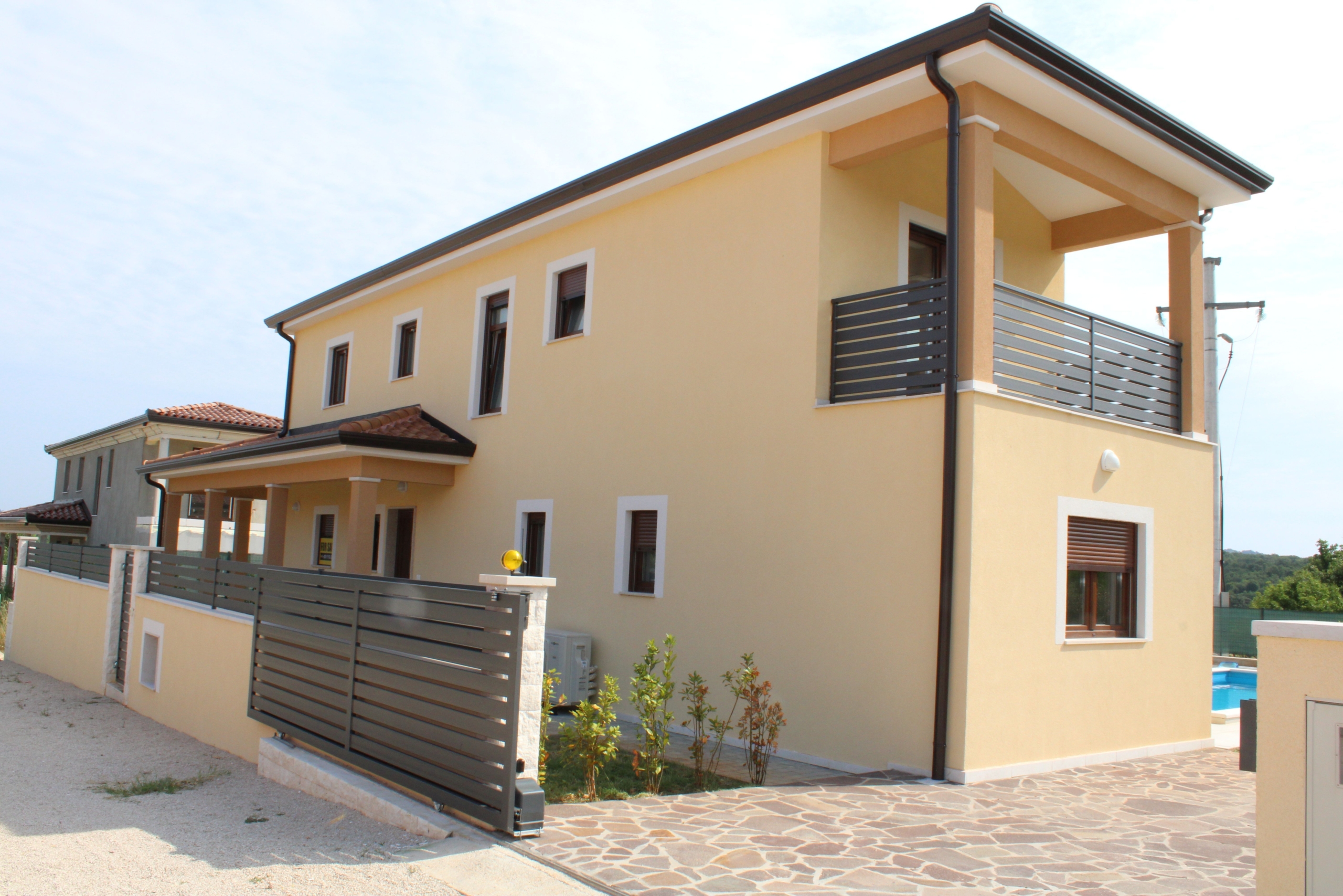 In ruhiger und gefragter Lage von Kaštel, im Ortsteil Kaldanija nahe Buje, befindet sich dieses moderne, freistehende Einfamilienhaus. Das Umfeld ist geprägt von hochwertigen Villen, überwiegend im gehobenen Feriensegment, wodurch die Attraktivität und langfristige Wertstabilität dieser Mikrolage zusätzlich unterstrichen werden.