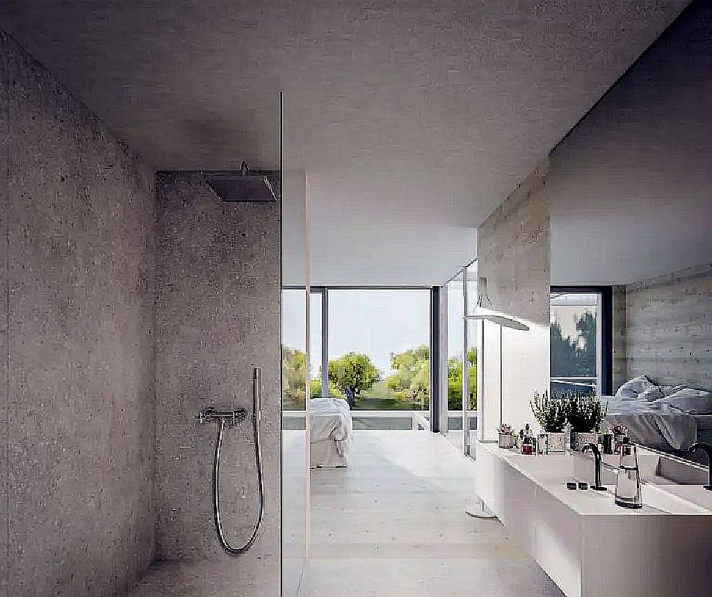 Im Obergeschoss befinden sich zwei großzügige Schlafzimmer mit jeweils eigenem Bad en suite. Sie bieten höchsten Wohnkomfort und maximale Privatsphäre. Fußbodenheizung, Klimaanlage, elektrische Jalousien sowie große Glasflächen sorgen ganzjährig für ein angenehmes Wohnklima. Ein Schlafzimmer verfügt zusätzlich über einen überdachten Balkon mit Blick auf die umliegenden Olivenhaine.